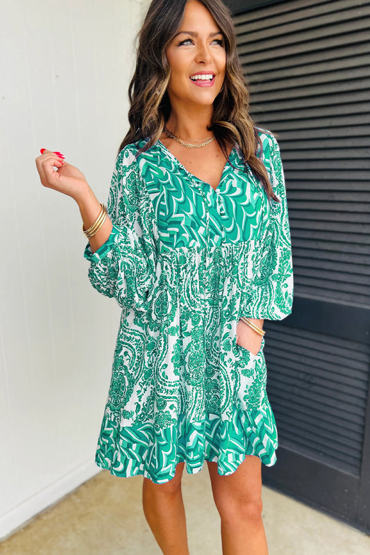 Green Bohemian Print Lantern Sleeve V Neck Flared Mini Dress